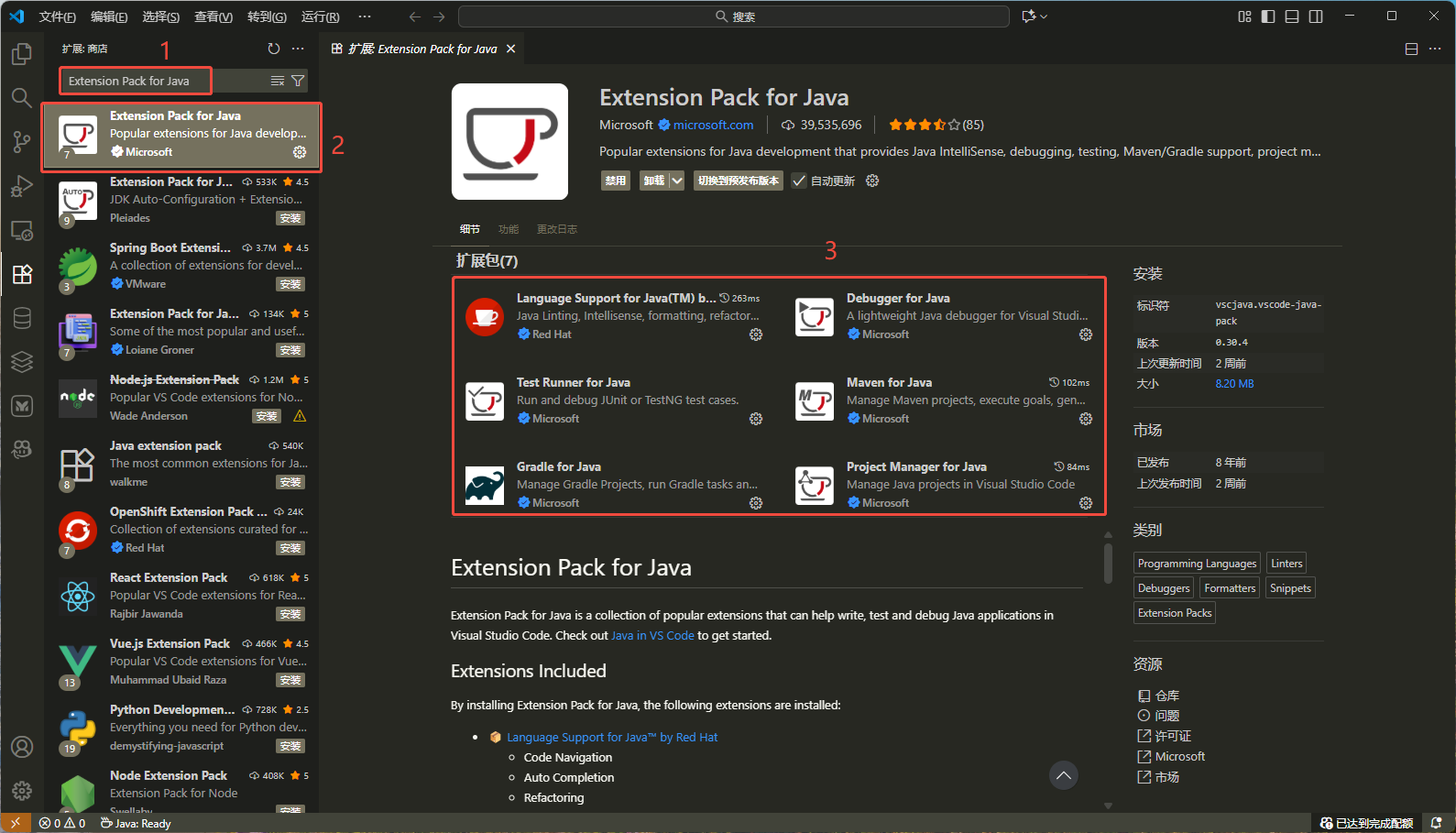 1. 首先我们得有一个装好的vscode,然后装上插件“Extension Pack for Java”(0.30.4),安装过程如图所示: