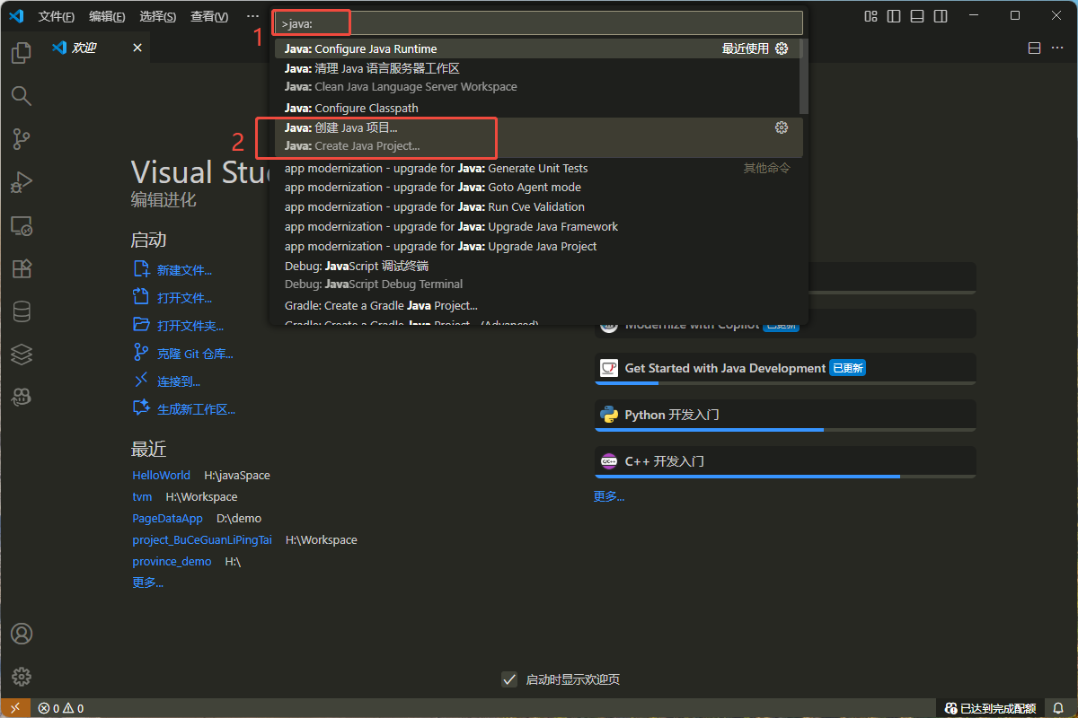 2. 摁“ctrl+shift+p”进入命令行输入框,然后输入“java: ”,下面会匹配到一个“Java: 创建 java 项目”,点击。过程如图: