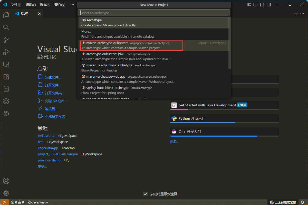 4. 继续在弹出的框中选择: "maven-archetype-quickstart"