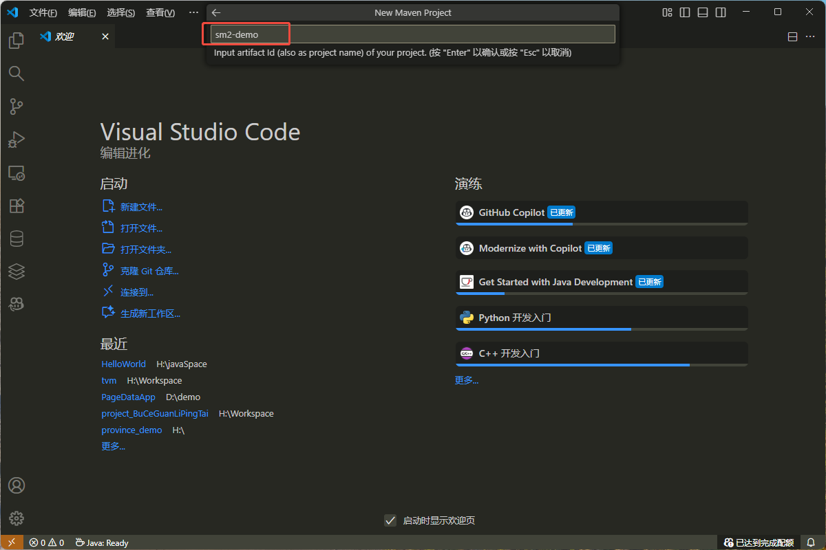 7.继续在接下来的输入框中输入Artifact Id:sm2-demo(项目名),截图如下: