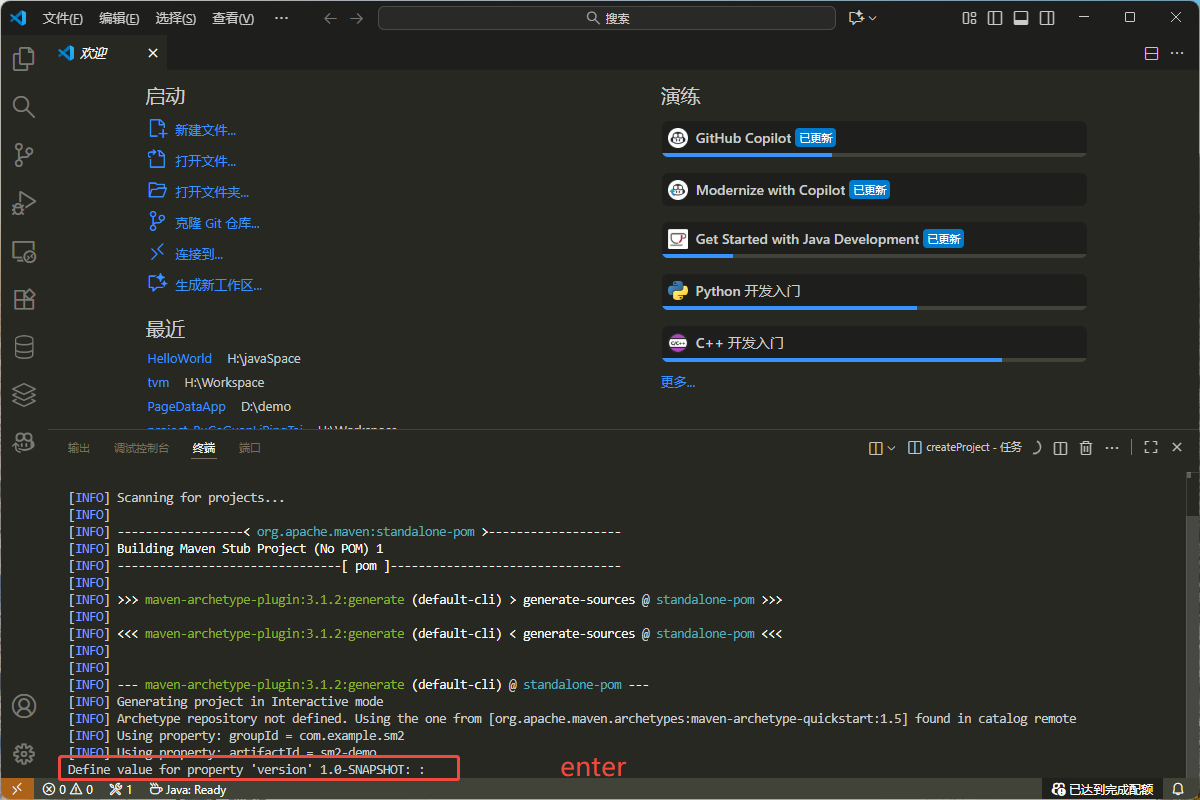 9. 然后在下面的终端窗口中会显示创建过程,当出现“Define value for property ...”时,直接摁“enter”