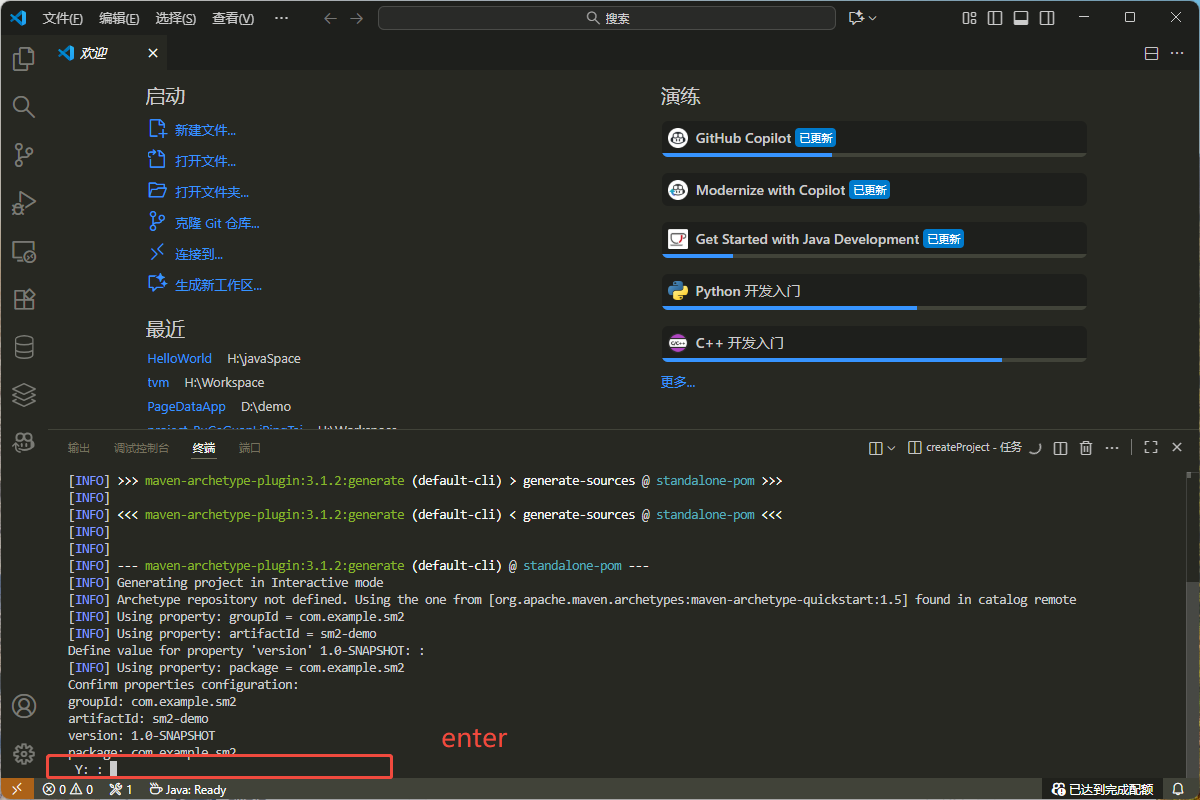 10. 然后创建过程会继续往下走,当弹出如下确认包名时,直接摁“enter”: